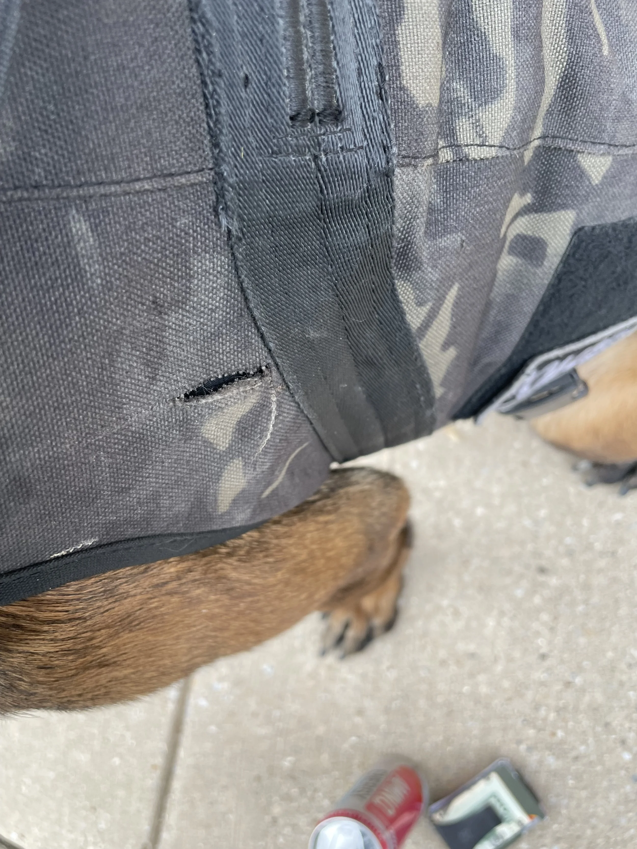 Last night, Amigo and I were finishing up some tracking training. This particular track took us to an area where a handful of vehicles were parked all very close together pending an auction. We try and train like we work and a majority of this track was done in the dark. As Amigo arrived to the parked vehicles he started to maneuver and navigate through the lot of cars. As he moved around a large tanker vehicle I heard a loud thud. I shined my light to the area and discovered that Amigo had run into the sharp corner of a large steel bumper. When I went to check him I discovered he had run into the corner of the bumper with his front left shoulder. The only thing that prevented a serious injury, a visit to the emergency vet and time off work was his K9 Storm Vest. On his vest I observed a mark from the bumper and a cut on the outer fabric.